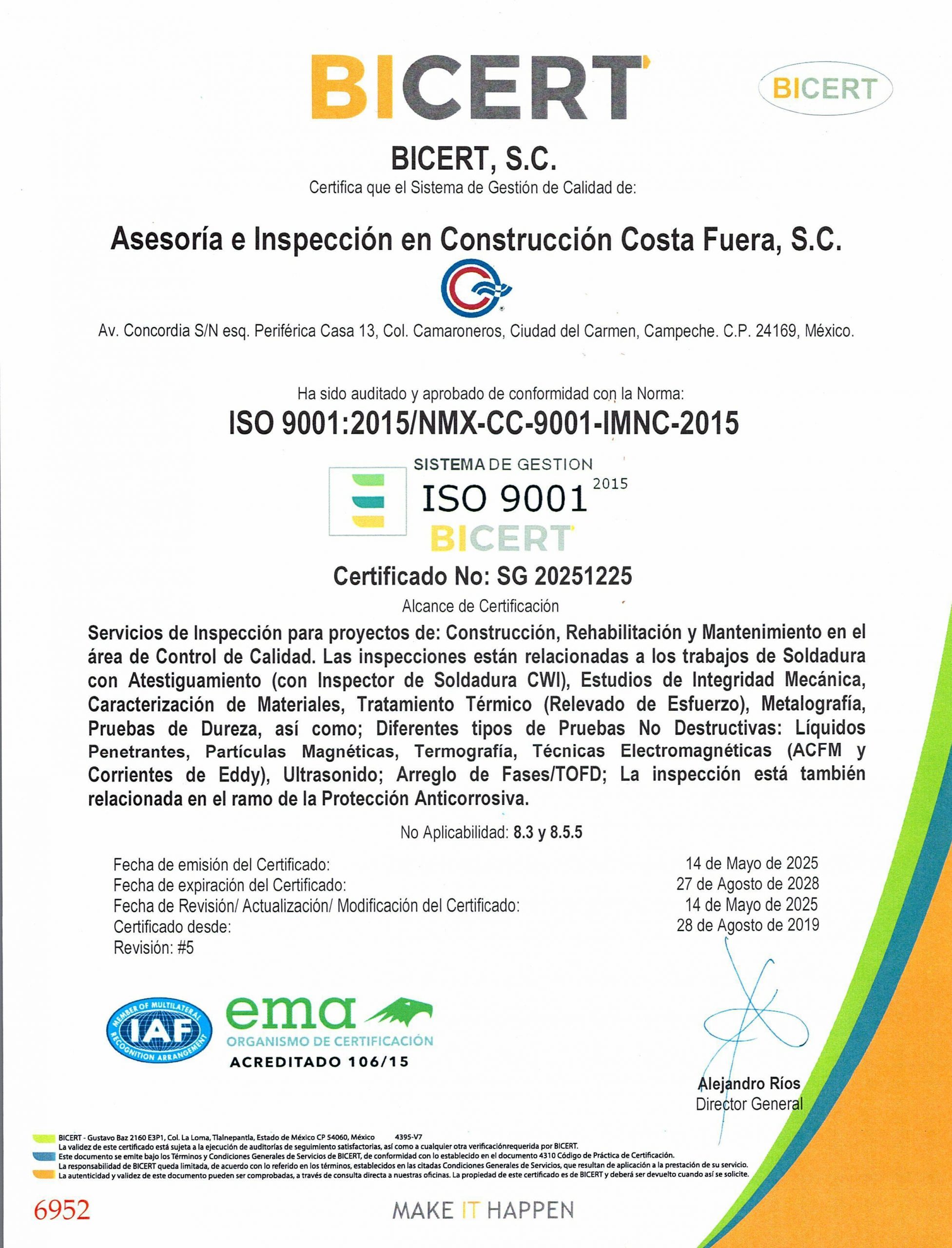 Nuestra operación se apoya con un sistema de gestión de la calidad conforme a ISO 9001:2015/NMX-CC-9001-IMNC-2015, que asegura consistencia en los servicios y fomenta la mejora continua.